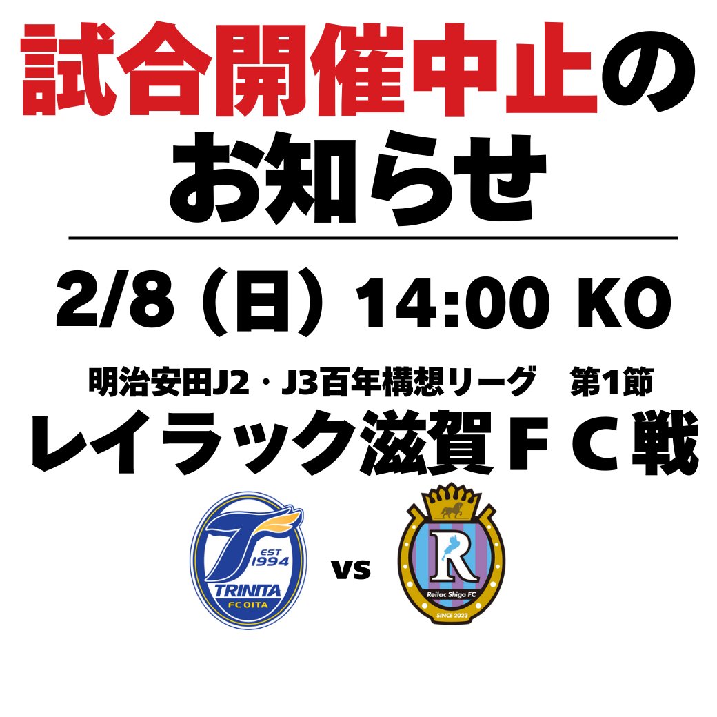 レイラック滋賀FC は、公共交通機関の運行停止、ドーム周辺の積雪および道路凍結などの状況を踏まえ、お客様の安全を最優先に考慮し、Jリーグ等関係各所と協議した結果、総合的に判断し開催中止とすることを決定いたしましたのでお知らせいたします。